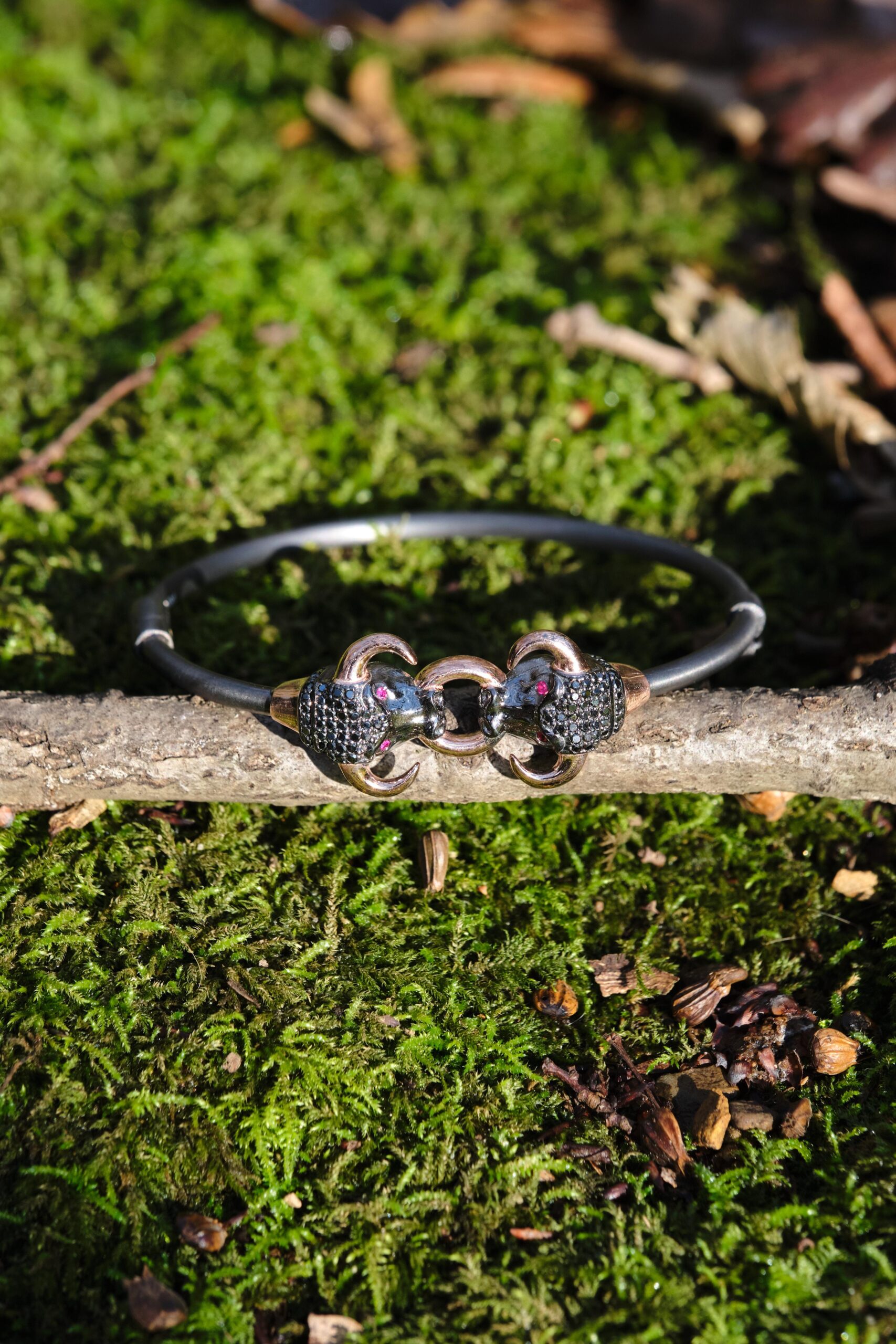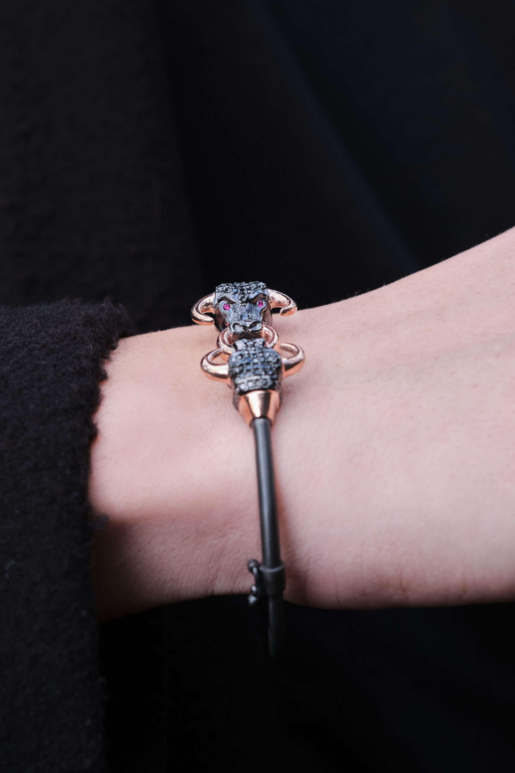 El Matador Çift Baş Boğa Kelepçe Bileklik 0.05 carat naturel yakut - 0.64 carat siyah pırlanta 14.21 gr 925 ayar gümüş