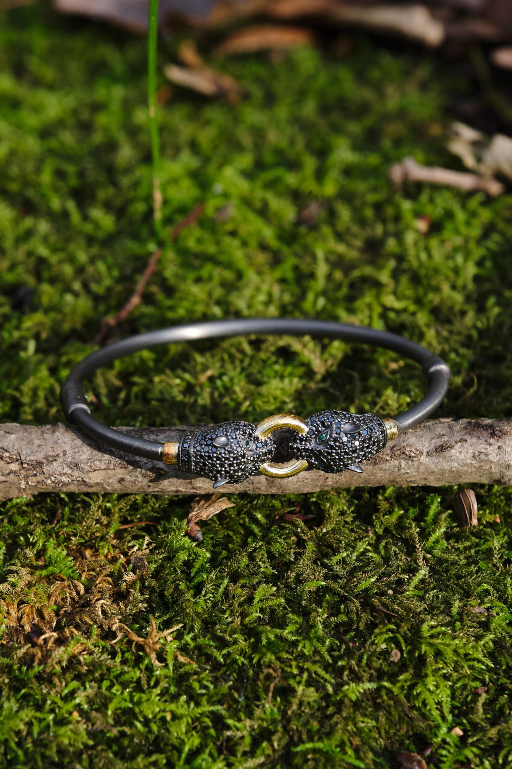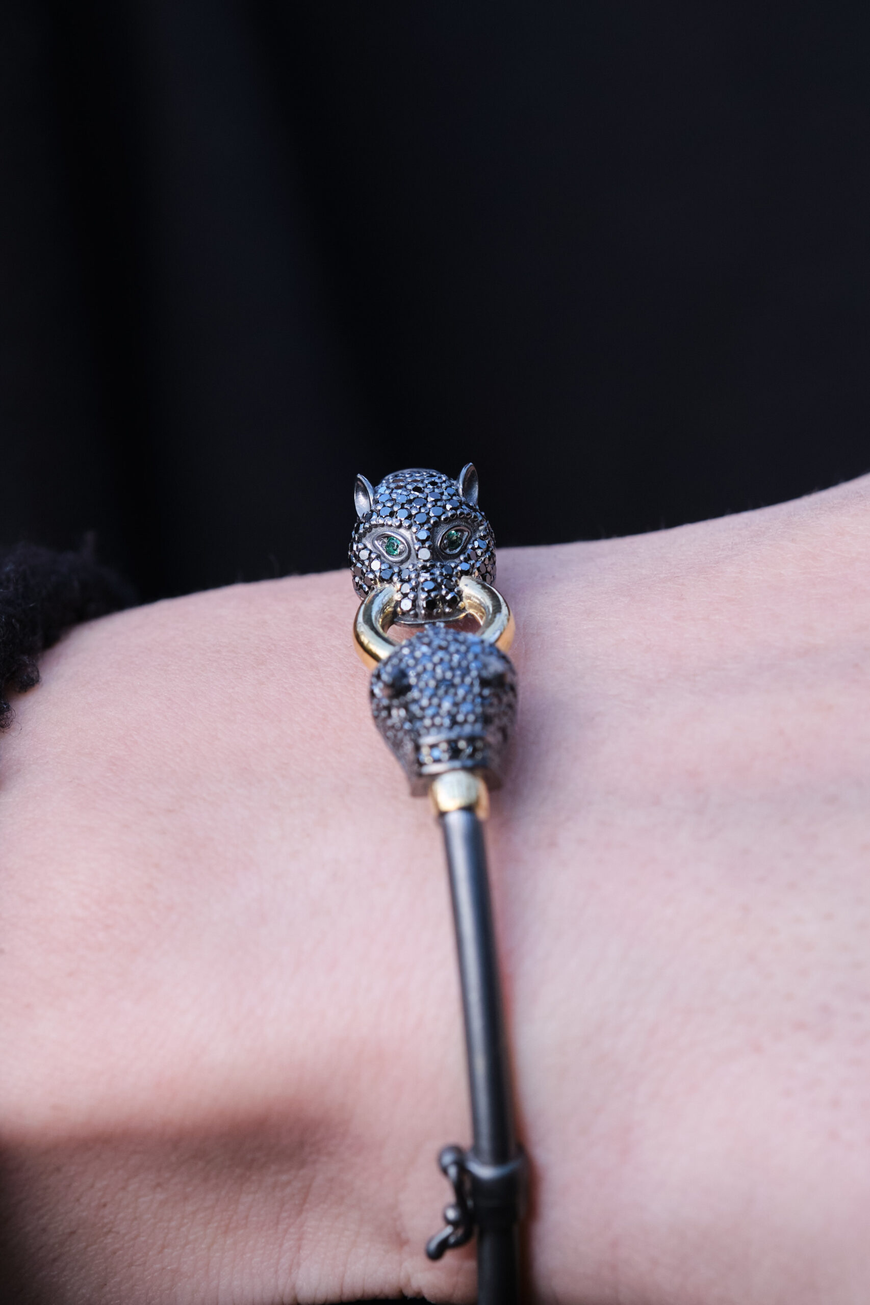 Siyah Çift Baş Panter Bileklik 0.03 carat naturel zümrüt - 1.42 carat siyah pırlanta 11.14 gr 925 ayar gümüş